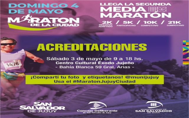 Se recuerda a los inscriptos a la Media Maratón que las acreditaciones se llevarán a cabo el sábado 3 de mayo de 9 a 18 hs. en el Centro Cultural Éxodo Jujeño. Mientras que los participantes de otras provincias podrán hacerlo el domingo 4 de mayo 7 a 7.45 hs.