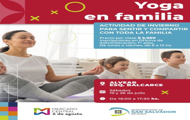 La Municipalidad de San Salvador de Jujuy invita a una nueva realización de la propuesta “Yoga en Familia”, que se llevará a cabo en el Mercado Municipal “6 de Agosto”, ubicado en Alvear esquina Balcarce, los días sábados 19 y 26 de julio.