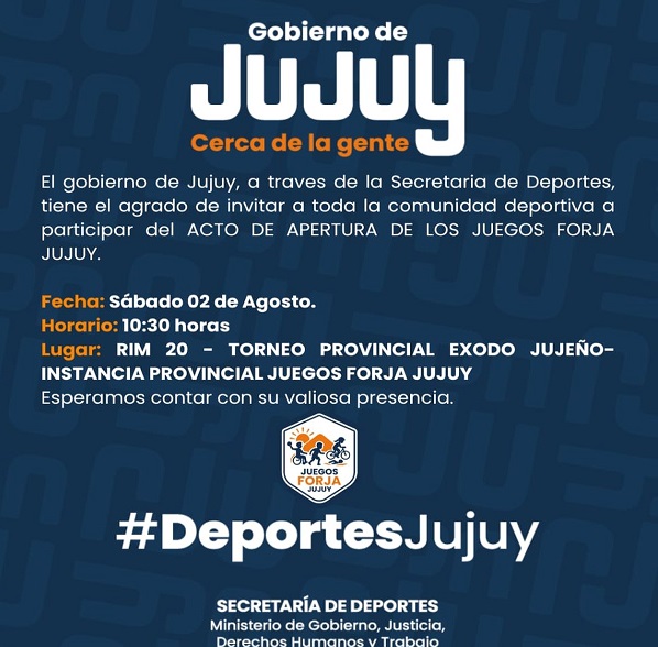 El Gobierno de la Provincia, a través de la Secretaría de Deportes, llevará adelante la apertura oficial de los Juegos Forja Jujuy, una propuesta que se implementa por primera vez con el objetivo de fortalecer el desarrollo deportivo e integrar a jóvenes de todas las regiones de la provincia.