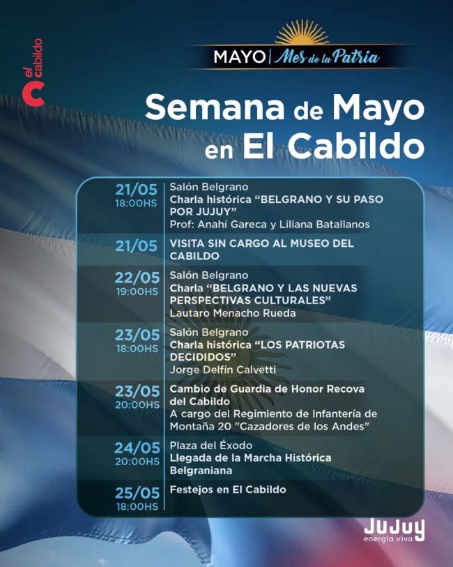 El Cabildo de Jujuy se prepara para vestirse de celeste y blanco. En el marco del Mes de la Patria, y con una agenda que combina memoria, cultura y participación, desde este miércoles 21 hasta el domingo 25 de mayo se vivirá una Semana de Mayo cargada de emoción, historia y orgullo jujeño. Todos los eventos serán con entrada libre y gratuita, pensados para que vecinos, estudiantes, familias y visitantes puedan reencontrarse con el pasado que nos une.