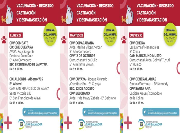 El martes 28, de 9 a 12 horas, los operativos se desarrollarán en el CIC Copacabana (avenida Marina Vilte y Chorcan, Alto Comedero) y el CPV 12 de Octubre (Gurruchaga y 9 de Julio, barrio Almirante Brown). En tanto, por la tarde, de 15 a 18 horas, las acciones se trasladarán al CPV Cuyaya (Roque Alvarado y Constitución, barrio Cuyaya), la Escuela 23 de Agosto y el CPV Belgrano (avenida 1° de Mayo y Zabala, barrio Belgrano).