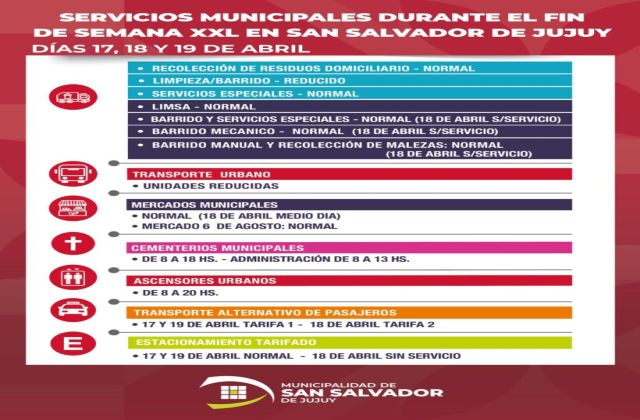 Con motivo del fin de semana XXL que incluye Jueves Santo (no laborable), Viernes Santo (feriado nacional) y el 432º aniversario de la Fundación de San Salvador de Jujuy el sábado 19 de abril, la Municipalidad de San Salvador de Jujuy informó cómo funcionarán los distintos servicios públicos durante estas fechas.