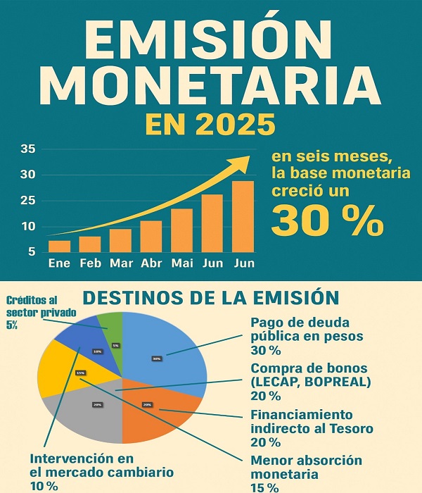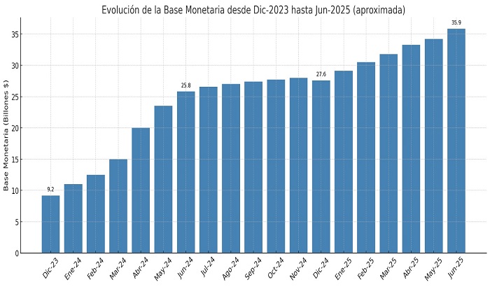 Según el Informe Monetario Mensual del BCRA, la base monetaria (es decir, el total de billetes, monedas y depósitos en cuenta corriente del sistema financiero) pasó de $ 9,2 billones en diciembre de 2023 a $ 35,9 billones en junio de 2025. Esto representa un aumento de más del 290 % en 18 meses.