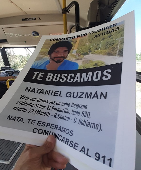 Remarcando en cuanto a la fecha de la desaparición, “por eso a tres años no pido celeridad en la investigación, ya fue, solo les exijo me digan lo sucedido a mi hijo Nataniel Guzmán, desaparecido en democracia, 38 años, abogado, empleado judicial, soltero, hacia stand up y amaba a su gato vito, quien quedo solo y encerrado en el departamento. Tomo un colectivo urbano, línea 630, int. 72 hacia Las Heras, Mendoza y nunca más se supo de él”.