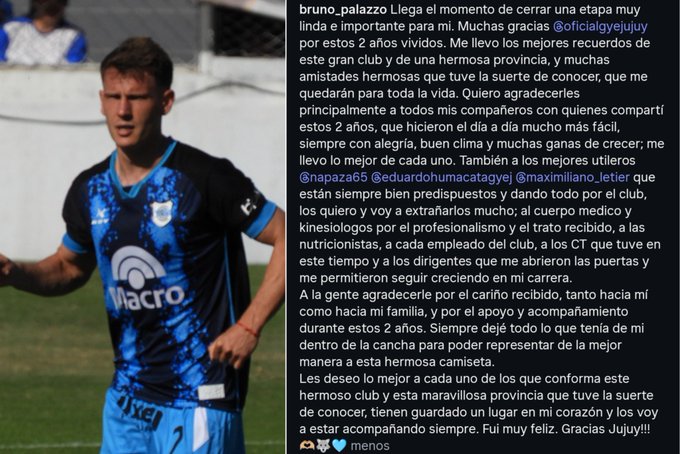 El defensor Bruno Palazzo anunció su salida de Gimnasia y Esgrima de Jujuy luego dos años en el club. «Llega el momento de cerrar una etapa muy linda», escribe el zaguero en un posteo que genera sorpresa en la institución que no hizo ningún anuncio oficial.