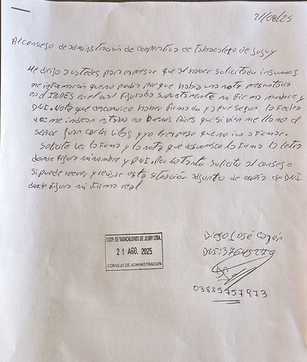 Es el caso de Diego Cazón, de Puesto Viejo, quien aseguró que jamás firmó ninguna nota, ya que en la fecha en que se habría presentado él se encontraba en Buenos Aires. En una carta dirigida a la Cooperativa, denunció que su firma fue falsificada y solicitó que la Institución actúe en su defensa.