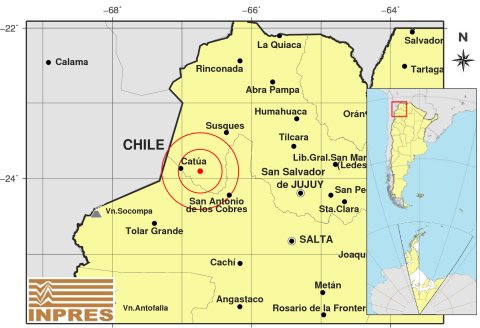 Y el tercer temblor registrado por el INPRES se produjo a las 07:38:47 horas y se ubicó a 32 kilómetros al Este de Cátua; a 50 kilómetros al Noroeste de San Antonio de los Cobres y 60 kilómetros al Suroeste de Súsques.