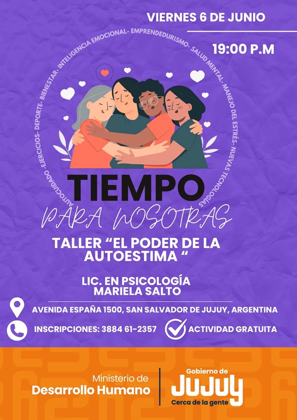 En el marco del Programa Tiempo para Nosotras, el Ministerio de Desarrollo Humano de Jujuy, a través de la Coordinación de Calidad de Vida dependiente de la Secretaría de Desarrollo Integral, llevará adelante un nuevo encuentro enfocado en el fortalecimiento de la autoestima como pilar clave para el bienestar emocional y el desarrollo personal de las mujeres.
