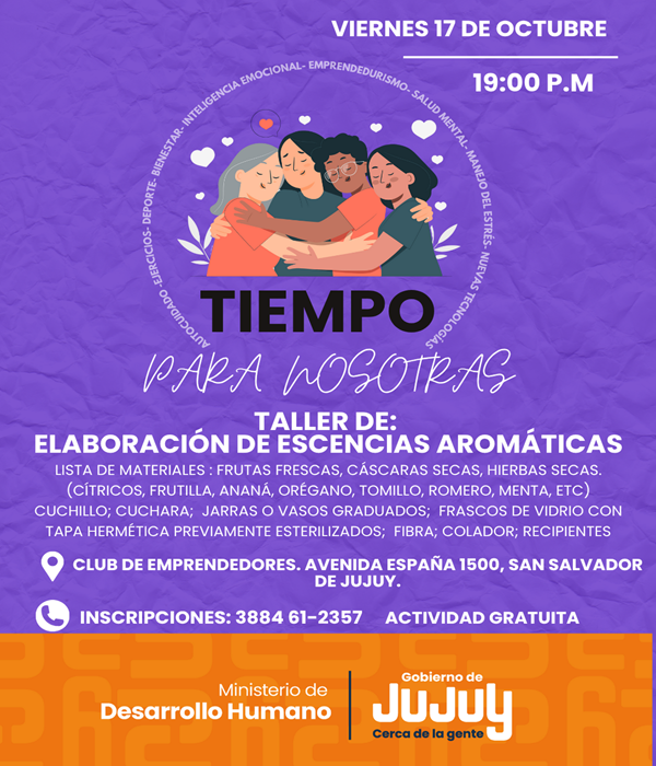 En el marco del programa “Tiempo para Nosotras”, el Ministerio de Desarrollo Humano, a través de la Secretaría de Desarrollo Integral, y la Coordinación de Calidad de Vida, invita a participar del Taller de Elaboración de Esencias Aromáticas y Extractos Alcohólicos, una propuesta de aprendizaje y bienestar destinada a mujeres emprendedoras y al público en general.