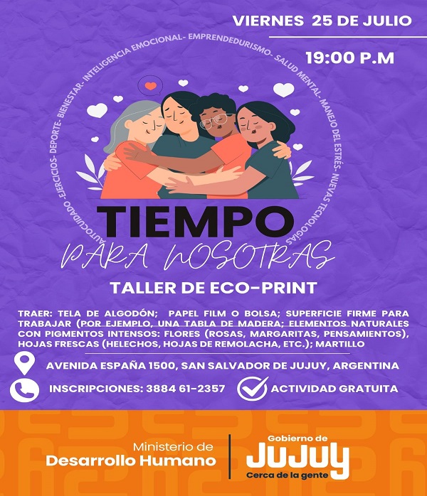 En el marco del Programa «Tiempo para Nosotras», el Ministerio de Desarrollo Humano de Jujuy a través de la Secretaría de Desarrollo Integral y la Coordinación de Calidad de Vida, invita a todas las mujeres a participar del Taller de Eco-Print, experiencia creativa pensada para reconectar con la naturaleza, el arte y el autocuidado.