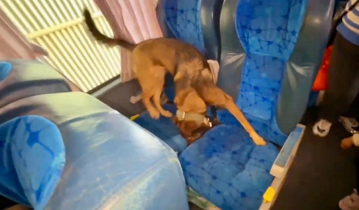 Luego de efectuar el pasaje con el can detector de narcóticos “Tati”, el cual marcó la presunta presencia de estupefaciente en butacas que se encontraban libres, los uniformados procedieron a profundizar la requisa del vehículo.