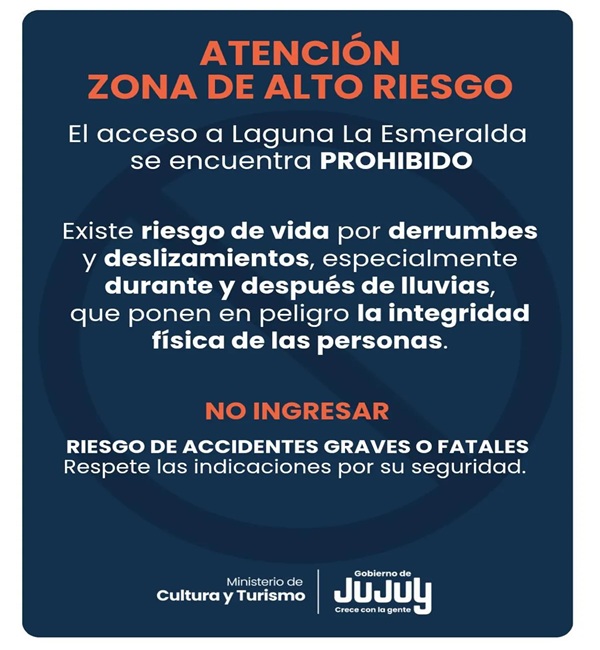 El espejo de agua se encuentra dentro de una reserva natural privada. No existe permiso de circulación vigente y el ingreso está prohibido por razones de seguridad geológica. La laguna se formó por el taponamiento de una quebrada cerrada y fisurada donde la caída de piedras es constante. Se registraron desmoronamientos.