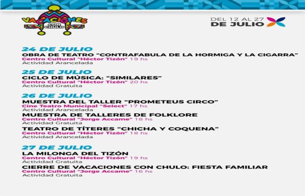 Hasta el domingo 27 de julio, se mantienen las propuestas del programa “Vacaciones con Chulo”, una iniciativa de la Municipalidad de San Salvador de Jujuy destinada a ofrecer actividades culturales y recreativas para disfrutar en familia durante el receso invernal.