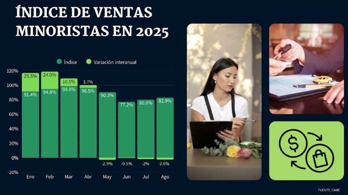 De acuerdo con la Confederación Argentina de la Mediana Empresa (CAME), en agosto las ventas minoristas de las pymes cayeron 2,6% interanual a precios constantes y 2,2% respecto a julio en la serie desestacionalizada. Con excepción de marzo, que había mostrado un ínfimo repunte del 0,1%, todos los meses de 2025 reflejaron bajas, lo que configura una tendencia preocupante para un sector que sostiene buena parte del empleo en el país. No obstante, al comparar con el mismo período del año pasado, el balance enero-agosto todavía arroja un crecimiento del 6,2%, explicado más por la muy baja base de comparación que por un verdadero impulso sostenido de la demanda.