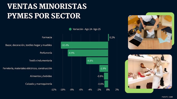 En el análisis por sectores, la situación fue dispar, aunque mayoritariamente negativa. Farmacia fue el único rubro que logró un resultado levemente positivo, con un alza del 0,2% interanual. El resto mostró retrocesos: bazar, decoración, textiles para el hogar y muebles se desplomó 10,4%; perfumería retrocedió 8,9%; textil e indumentaria bajó 4,8%; ferretería, materiales eléctricos y construcción cedió 1,9%; alimentos y bebidas retrocedió 0,9%; y calzado y marroquinería cayó 0,8%.