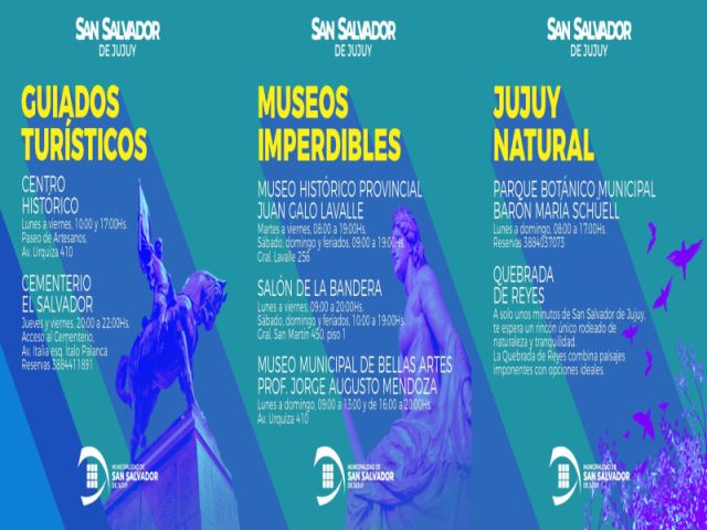 En este sentido, la Dirección de Turismo de la Municipalidad de San Salvador de Jujuy, invita a los vecinos a optar por las visitas guiadas, realizando recorridos por el centro histórico de lunes a viernes a las 10 y 17 horas, con punto de partida en el Paseo de Artesanos, ubicado en Avenida Urquiza 410. También se ofrecen visitas guiadas en el Cementerio el Salvador los días jueves y viernes de 20 a 22 horas, con acceso por Avenida Italia esquina Ítalo Palanca. Los interesados en participar pueden solicitar reservas llamando al número 388-4411891.