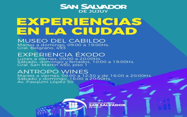 La propuesta municipal continúa con “Experiencias en la ciudad”, que incluye visitas al Museo del Cabildo (Gral. Belgrano 493) de martes a domingo, de 9 a 19 horas. Además, la propuesta contempla la “Experiencia Éxodo” (San Martín 450, Piso 1), de lunes a viernes, de 9 a 20 horas, y sábados, domingos y feriados, de 10 a 19 horas. Otra opción es visitar Antropo Wines en Avenida Pasquini López N°. 50, para degustar diferentes sabores y bebidas, de martes a viernes, de 9 a 12:30 horas y de 16 a 20 horas; y sábados y domingos, de 16 a 20 horas.