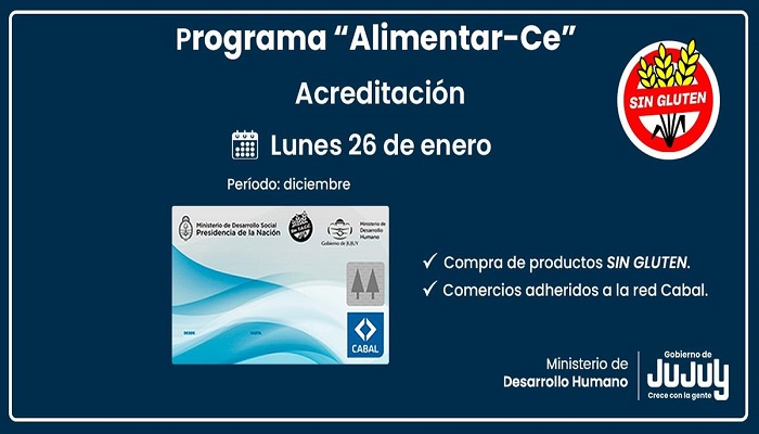 El Ministerio de Desarrollo Humano, por medio de la Secretaría de Asistencia Directa y , comunica que el lunes 26 de enero, se realizó la acreditación de la tarjeta Alimentar-Ce, destinada celíacos del programa “Alimentar-Ce”.